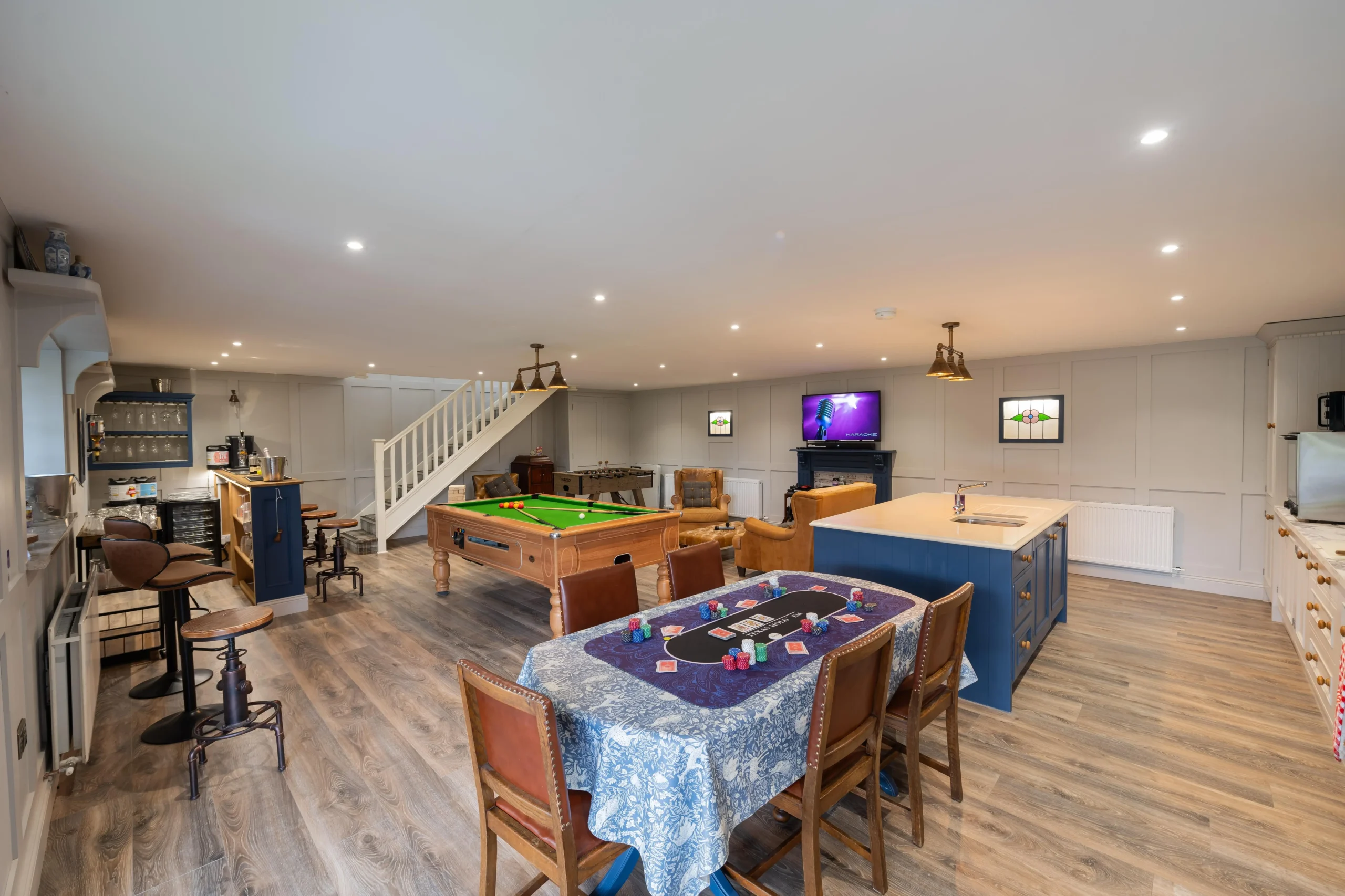 Features include comfortable living rooms, generous dining areas, three kitchens for easy self-catering, a courtyard snug, and a private bar and games room for evenings together.